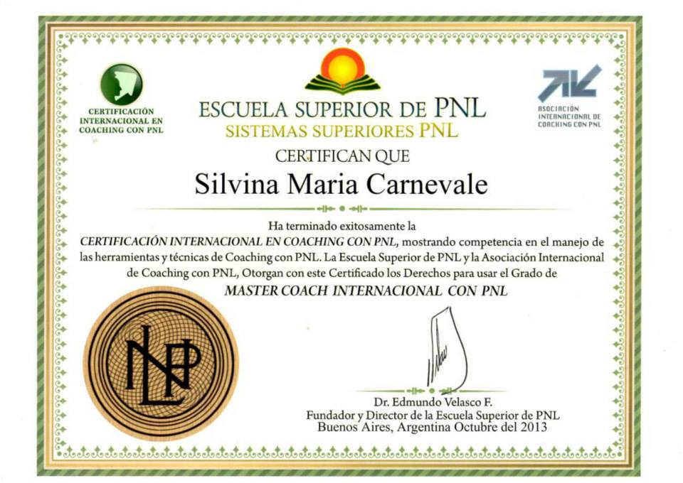 - Master Coach Internacional con PNL – Escuela Superior de PNL – Dr. Edmundo Velasco (ex-socio por 17 años del Co-Creador de la Programación Neurolingüística “John Grinder”) – 90 horas